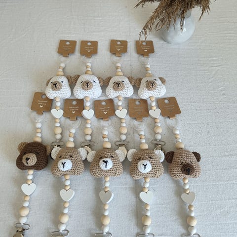 Håndlaget baby Unisex smokkesnor med filtdyr. Festes til smokken med hempen på enden av snoren og med klips til barnets klær. Silikonadapter er inkludert. www.facebook.com/DearLittleLove ❤️ Instagram: Dear_Little_Love