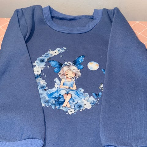 Rosa genser med blomster og prinsesse / fe som dekorasjon. Genser er brukt men hel og fortsatt fin i fargen.