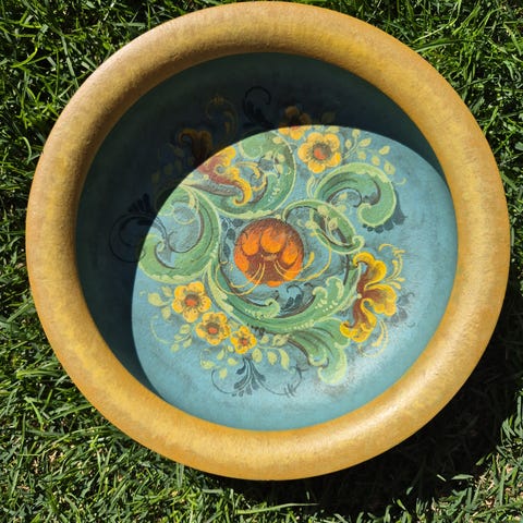 Gammelt rosemalt trefat, Ø 25 cm. Flott for alderen.