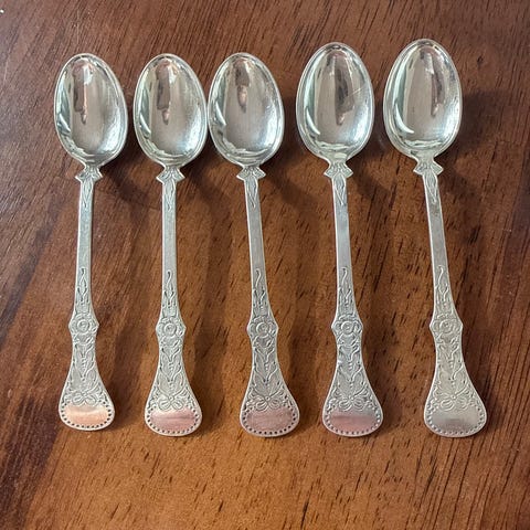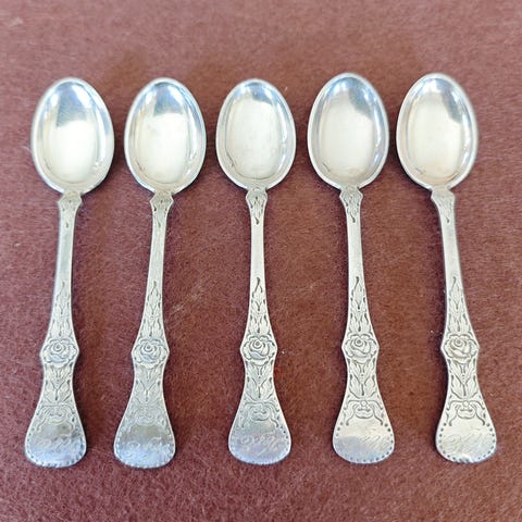 5 store gamle sølv skjeer . Meget pene . Kan sendes om ønskelig eller møtes et egnet sted etter avtale . Eller hentes Grimseid .