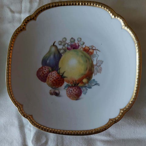 Tallerken m fruktmotiv 21cm i diameter som ny men gammel