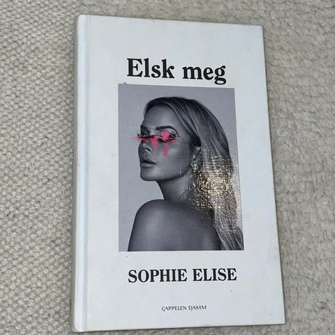 Litt Sophie-totebag + hennes bok «Elsk meg». Boken er innbundet, med nypris på 379,-. Bærenettet er fra bokklubben Litt Sophie.