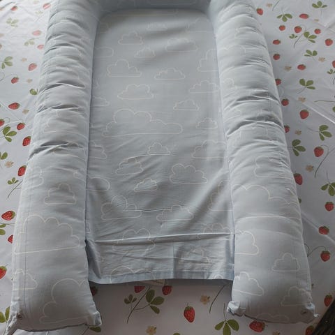 Selger nydelig babyrede sydd av fortryllende by Charlotte. Kan vaskes på 40 grader i maskin og tørketromles. Mintgrønn med mønster på en side,grå på den andre siden.