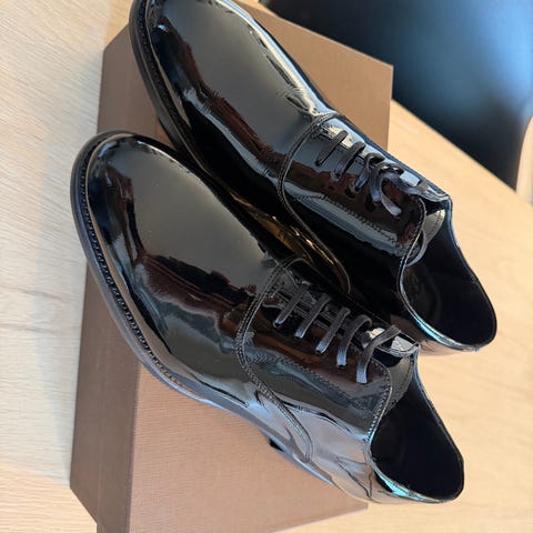 Skoene er håndlaget i England og kommer i sin originale eske samt med to stykk tørke duker.