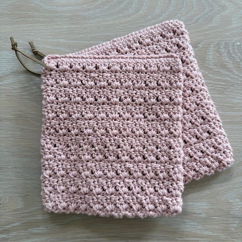 Praktiske og doble grytekluter i godt bomullsgarn. Gryteklutene holder godt på varme og er i tillegg et vakkert tilskudd til kjøkkenet ditt.