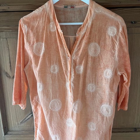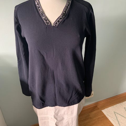 Står str 10, (M/38) men veldig liten i str. Tilsvarer mer en str 36 (derfor for liten for meg som normalt bruker 38). Flott kvalitet! Behagelig stoff som faller flott. Klassisk enkel modell hvor halskanten utgjør det lille ekstra. Alltid velkledd med denne, både til jeans og skjørt.