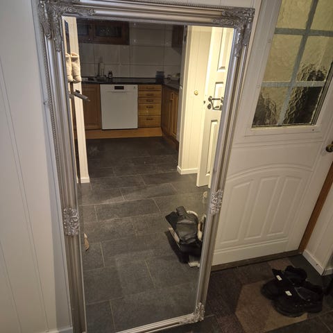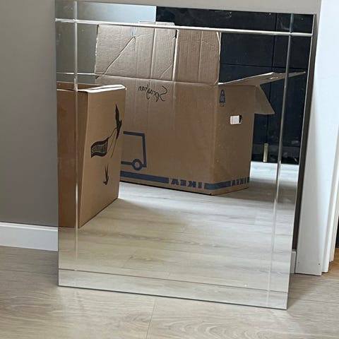 Selges et mellomstort speil som jeg ikke har brukt for lenger. Helt og pent! Ingen oppheng mulighet, må stå på en kommode, bord etc.. inntil en vegg