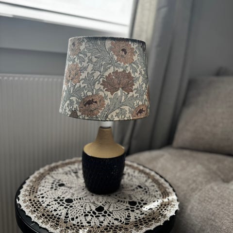 Bordlampe med nydelig lampeskjerm som gir deilig stemning. Lampen er 45 cm høy (med skjermen) og foten er 11 cm i diameter. Lampeskjermen er 10 cm øverst, 17 cm nederst og 17 cm høy. Lampefoten i metall, brunsvart farge.