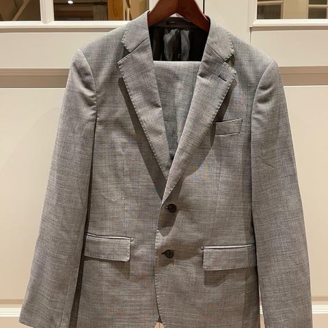 Bukse str 34/32, jakke str 48. Slim fit dress 42 prosent ull. Har også slim fit skjorter. Alt fra Dressmann