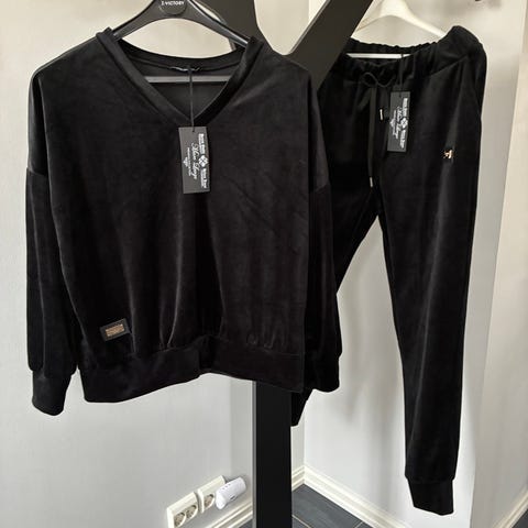 Superfint og behagelig sett i sort. Buksen er størrelse XS, og genseren er M, men settet oppleves generelt som en S. Det er helt nytt med lapper. Materiale: 75% polyester, 25% bomull. Jeg sender stort sett alltid første virkedag etter mottatt penger for frakt :)