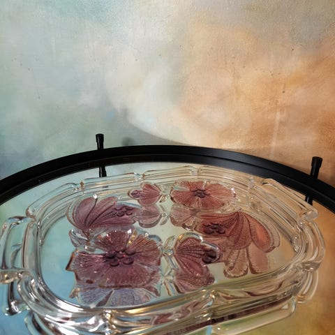 Nydelig fat i gammelrosa og sølv med hank. B: 26 cm. ....Sender ikke
