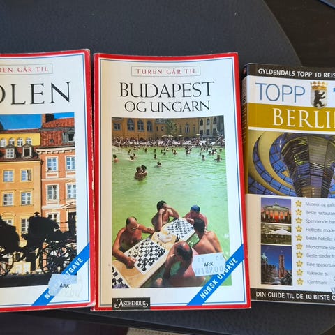 Pent brukte reiseguider Praha og Budapest i farger. Selges 100kr pr stk