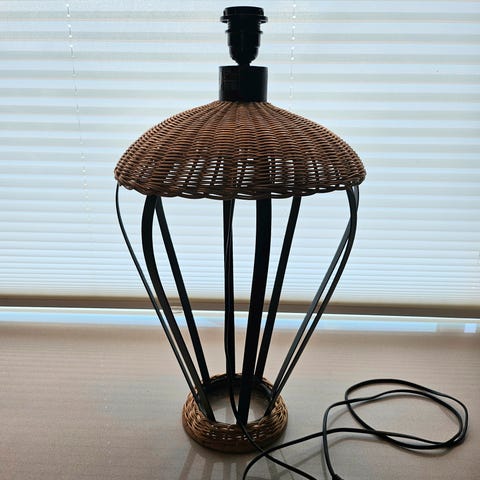 En bordlampe i tre (usikker på type tre), knudret fot, diam 25 cm, høyde 40 cm med pæreholder. 1stk lampett i tre med utskjæringer, 2 stk lampeskjermer som passer sammen med lampetten.