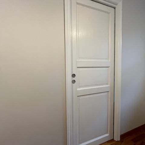 Et dørblad er profesjonelt hvitmalt med spraymaling.