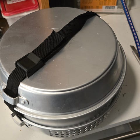 Vet ikke hva dette kasserollesettet heter. Men jeg tror kanskje det er stormkjøkken. Men du som ser annonsen kan det sikkert bedre enn jeg. Det er ubrukt, men trekket har hatt litt for nær kontakt med varme og har derfor fått noen huller. Selges kr 200
