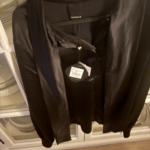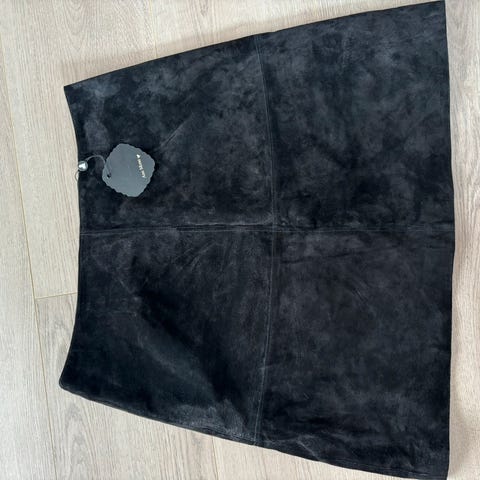Kjempe fint skinnskjørt i størrelse 36. Er ganske sikker på det er fra Ane Mone ut i fra logo, men det er ikke merkelapp inni. Underskjørt i silke.