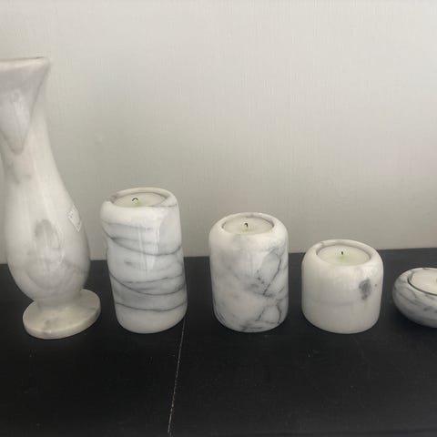 Den gule vasen bakerst kr. 70. Den er 20 cm høy og veier 1,5 kg. Settet med 3 lysholdere kr. 80.