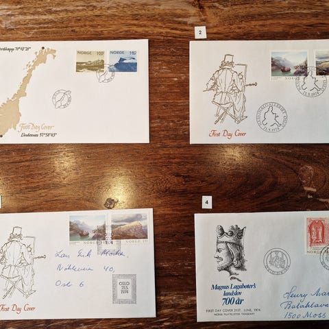 4 fine norske konvolutter med illustrasjon av steder. Fint frankert og fint stemplet. Post gått i 2020.