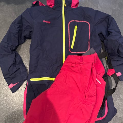 Veldig lite brukt skijakke fra Bergans, str 164/14. Brukte få ganger i slalåm bakken. Ser som nye ut. Avtagbar hette. Snøskjørt. Lommer med glidelås, lommer innsider, lommer for skikort, ventilasjonsglidelåser under ermene. kr 800