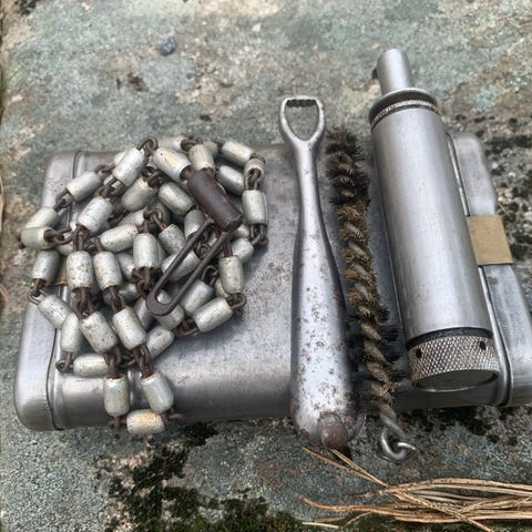 - Pussesett pistol, Luftforsvaret. ( blå boks ) Snor ca. 2 m lang, lodd 7 mm kr. 150,-