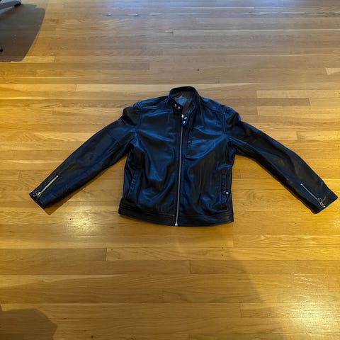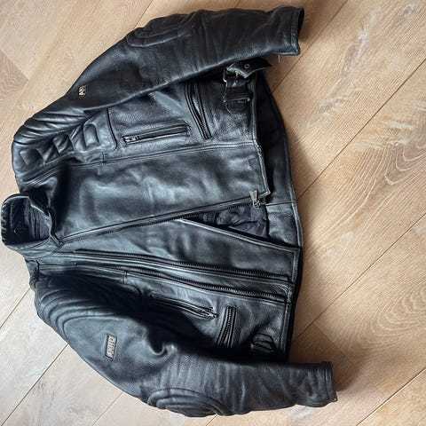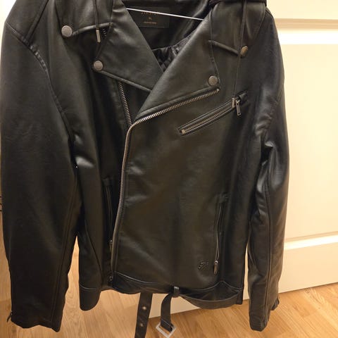 Tøff lys skinn jakk i størrelse 2XL. Kort i livet. Lange armer.