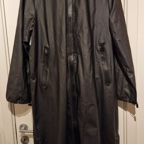 Sort regnkåpe med utvendige lommer, en innerlomme med glidelås, avtagbar hette og belte. God og varm i regn og vind. Brukt kun to ganger og fremstår som ny.