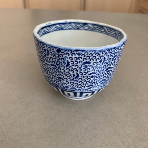 Vakker og lett vase med mønster i japansk stil. Jord- og naturfarger, bl.a. oransje. Ingen skår eller skader. Porselen?