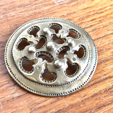 Kjempefin vintage retro art deco brosje i stanset messing og orange glass selges kr 150,-