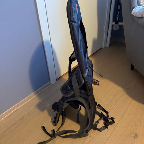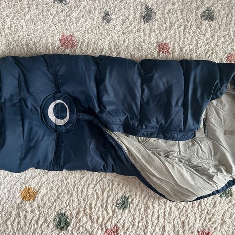 Pent brukt sovepose til baby i rød farge med mørkeblått fór inni. Snor til å trekke sammen øverst i åpningen på soveposen.