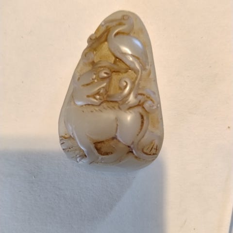 Vakkert skåret i celadon jade sten med innslag av brun. Fin form og god å holde i.