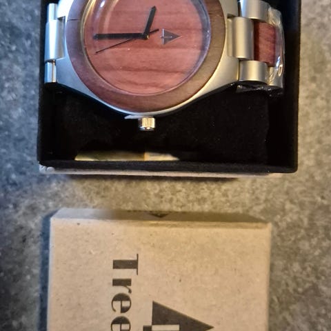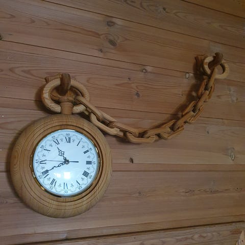 Klokke laget av tre og har lærreim