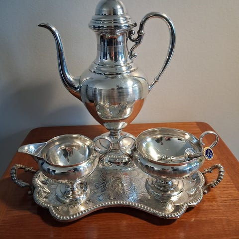 Et fantastisk, og det adjektivet tar jeg ikke ofte frem, antikk/antikt te- og kaffeservice bestående av serveringsfat, tekanne, kaffekanne, fløtemugge og sukkerskål.