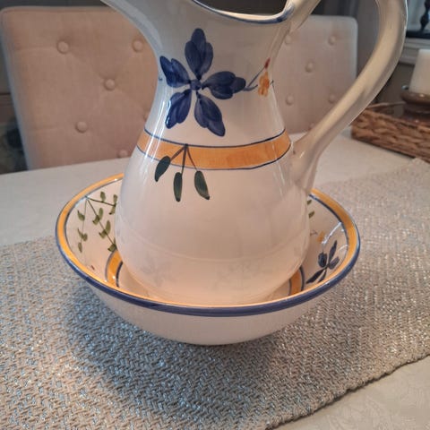 Koselig og helt keramikk sett. Kun vært brukt til pynt! Ingen avskalling eller merker. Høyde på mugge er 15, diameter bolle /fat er 23cm.