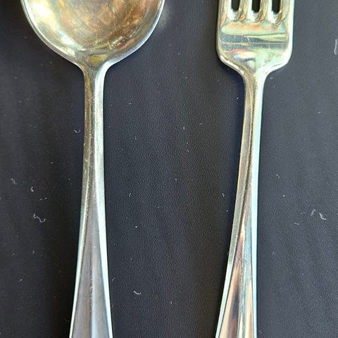 Serveringsskje (21 cm) og to koldgafler/påleggsgafler (13 cm) i nysølv selges.