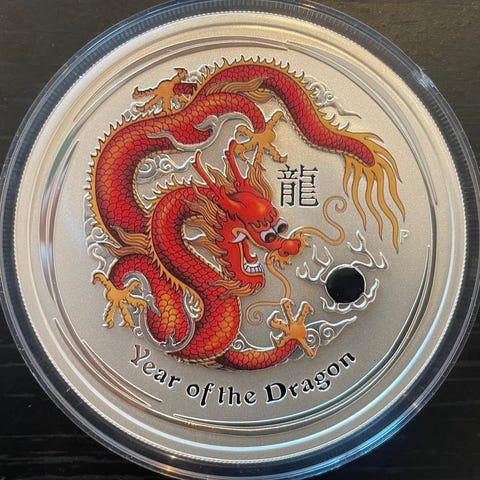 2012 AUSTRALIA 2 OZ SØLV LUNAR S2 «YEAR OF THE DRAGON» BU M/KAPSEL Lavt opplag.
