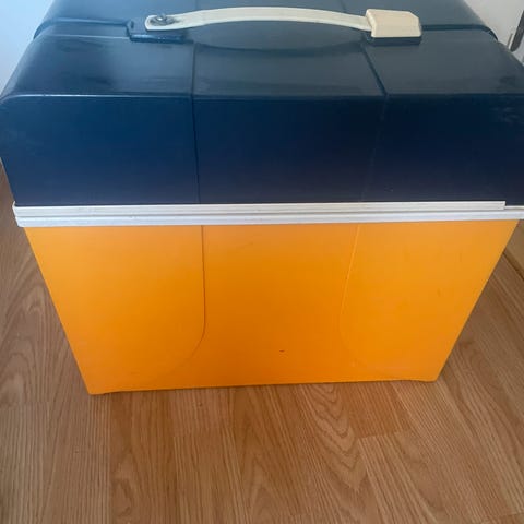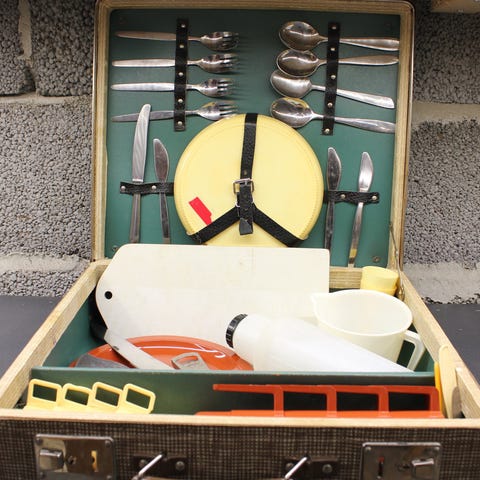 En nostalgisk blå piknikkoffert i hardplast fra det glade 70 tallet med innhold selges.