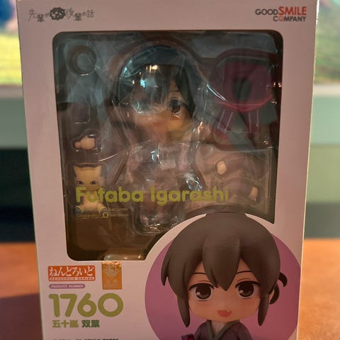Good Smile Company Nendoroid 1106 Rikka Takarada figurine med utskiftbare deler og tilbehør. Figuren viser karakteren Rikka Takarada med blått hår, iført skoleuniform med hvit jakke og rød sløyfe. Inkluderer et skrivebord med en liten skjerm og andre detaljer. Passer til samling og visning.