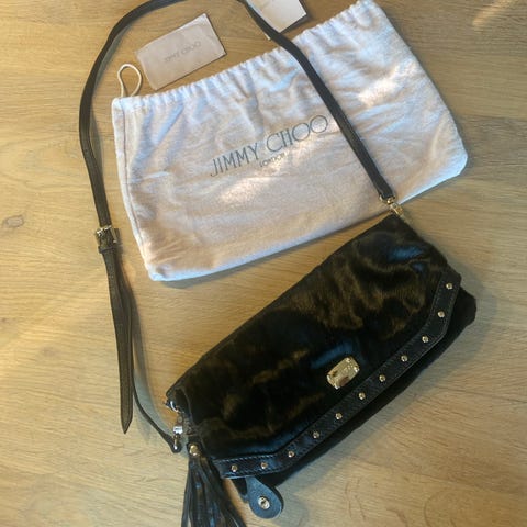 Jimmy Choo x HM clutch i sort kroko-preget skinn. Stjerne med bling/krystaller og Jimmy Choo-logo i front. Den perfekte party-vesken!✨Meget god stand. Dustbag og original pose medfølger.