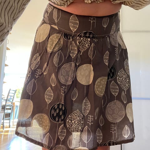 Skjørtet passer fint til mørk brune sko fra b&co i str 38 og til brun cardigan fra vero moda i str XS.