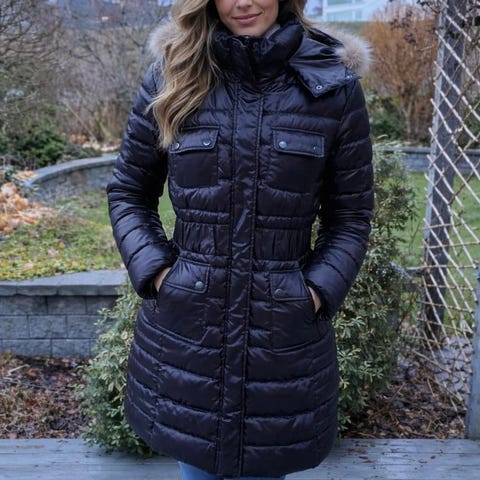 Varm dunjakke fra svenske Snoot. Fylt med gåsedun og med ekte, avtagbar, pels rundt krage.
