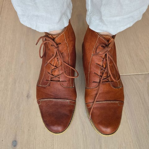 Ordinær pris 530€, pent brukt nydelig og super behagelige håndlaget skoletter, med strikk indre og ytre ankel.lett og ta på og av og sitter meget behagelig på foten. Puster, og er vannavstøtende. Såle ikke slitt overhode og ikke gått inn.