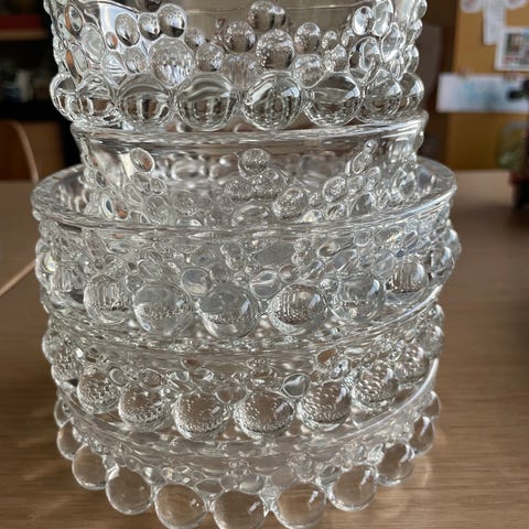 Vurderer å selge en nydelig dessert sett med 1. stor bolle og 8 dessertskål merke Spiegelau. Brukte kun en gang og stått i skapet ellers, selger pga plassmangel. Selges alt for 700kr Det er en herlig dessert sett og kvalitetsvarer verdt å ha.Kjøpte fra Tilbords.