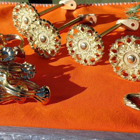Håndkle-, hylle- og toalettrulloppheng i gullforgylt metall fra 60-tallet i merket: Lan-Bar Dolphin Range. Utmerket tilstand.