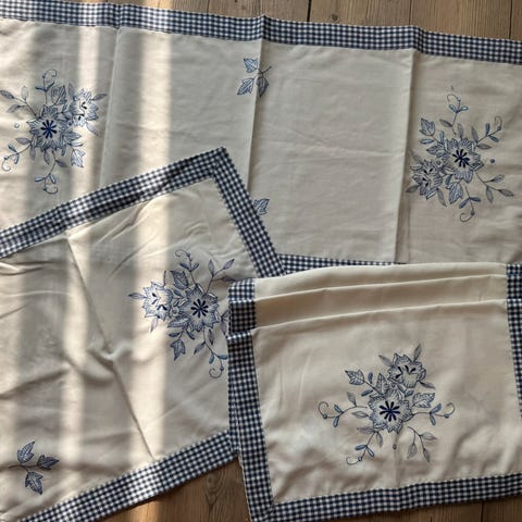 3 duker. En 20 cm X 20 cm, en løper 20 cm X 40 cm, en 40 cm X 40 cm. Grytekluter vattert 10 cm X 10 cm. Pyntehåndkle 30 cm X 60 cm. Blå ruter og blomstermotiv.