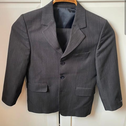 Flott dress til gutt, skreddersydd i Thailand hos Amorn’s (www.amorns.com). Topp kvalitet, nydelig tynt ullstoff. Fargen er matt sort, bildene viser ikke helt riktig farge. Ca str 10 år.