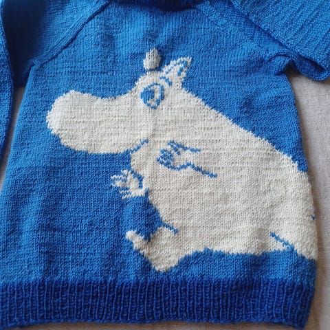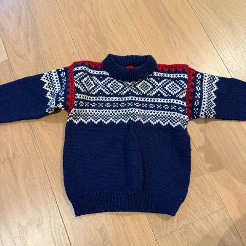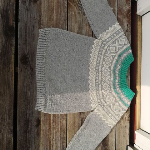 Genser med raglanfelling og Mariusmønster på magen str 4-5 år kr 330,-