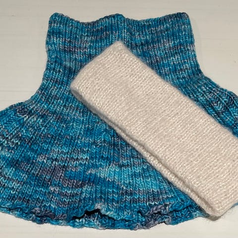 2 lite brukte halser. Den ene er kjøpt, og den andre (rosa) er hjemstrikket i mohairgarn.