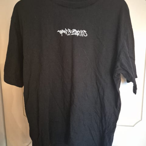 Sort t-shirt med The Matrix nummere, har noen hull, og det pleide å lyse, men er nå ødelagt (tror jeg). Størrelse Small /XS menn, Medium dame.