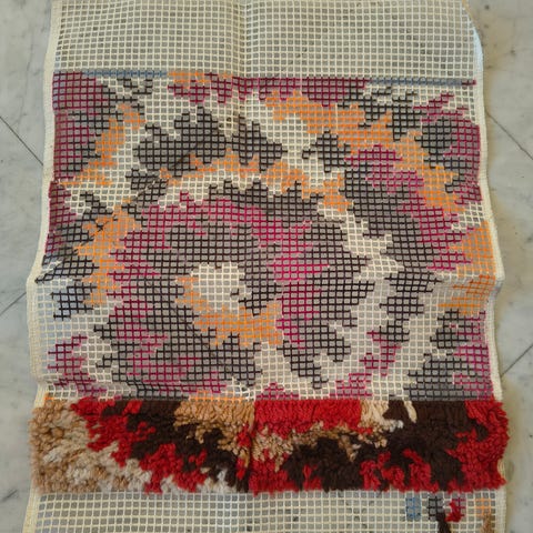 Knytteteppe prosjekt som aldri ble ferdig. Selges med mye tråd, noe klar til bruk og ellers endel garnnøster som må klippes opp. Mønsteret er egenkomponert så her kan en la kreativiteten blomstre. Selges som det er og med tilhørende nål. Sendes mot porto.