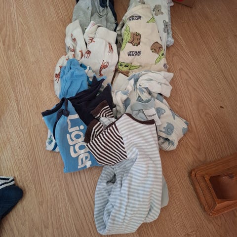 Ull bodyer er godt brukt. Det er hull på bodyene. 250for alle 6. 2 bukser er hele og fine 100 kr for begge.